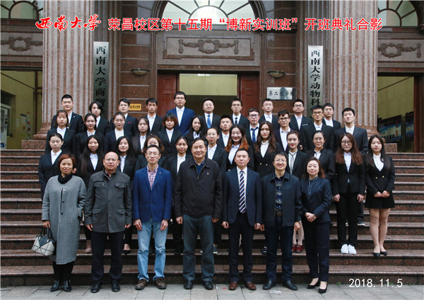 2018年11月5日,西南大學第十五期“博新實訓”班開班典禮暨開班第一講在榮昌校區2309會議室隆重舉行,西南大學榮昌校區管委會主任左福元、成都思來生物科技有限公司董事長王峰、西南大學榮昌校區管委會副主任趙智華、西南大學榮昌校區教務主任曾仁權等領導出席開班典禮。