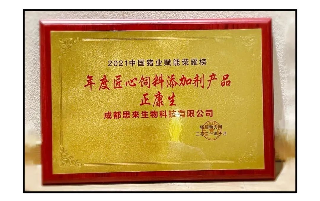接著,會議第二項議程——“2021中國豬業賦能榮耀榜頒獎典禮”召開。本次頒獎典禮上,思來生物旗下產品——正康生®Plus榮獲“2021年度匠心飼料添加劑產品”獎項。