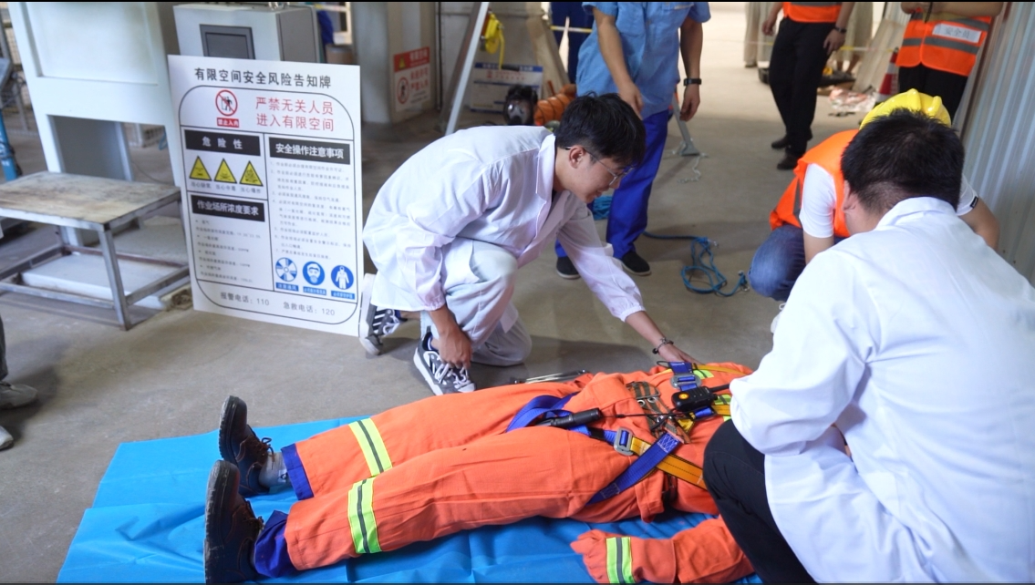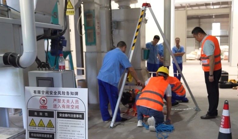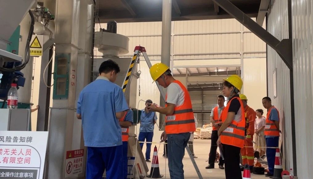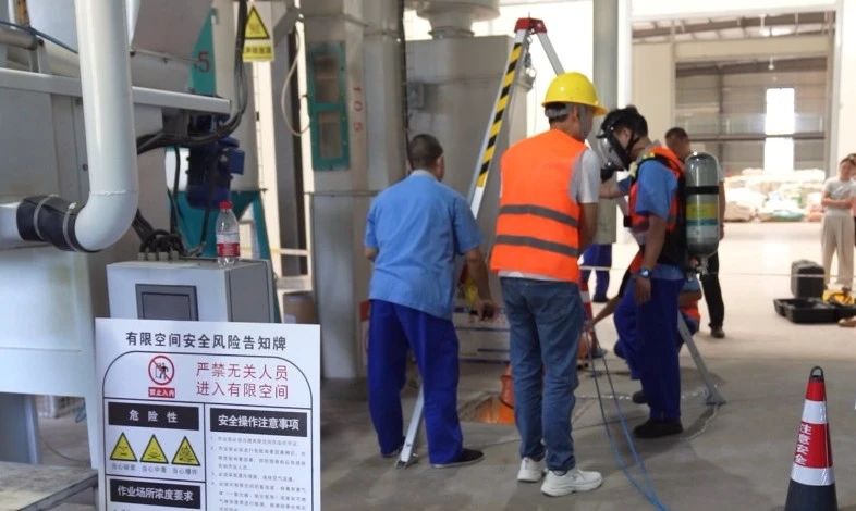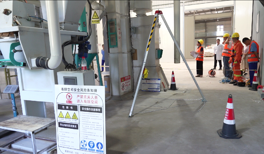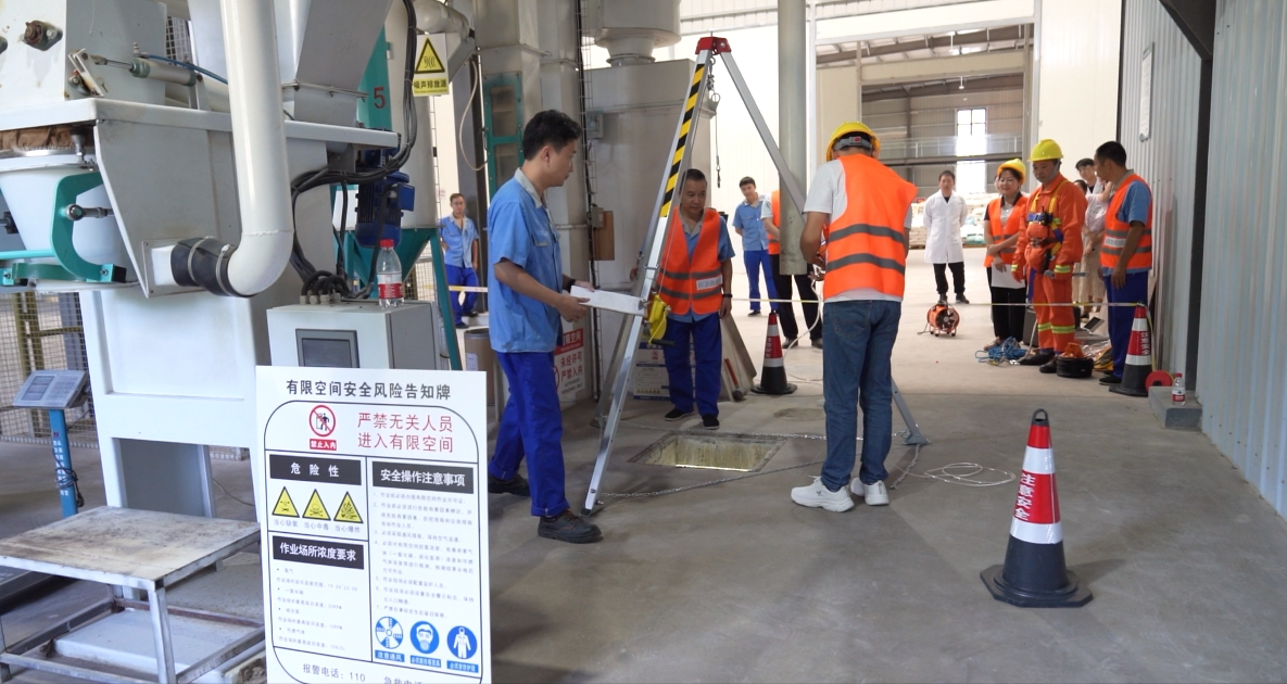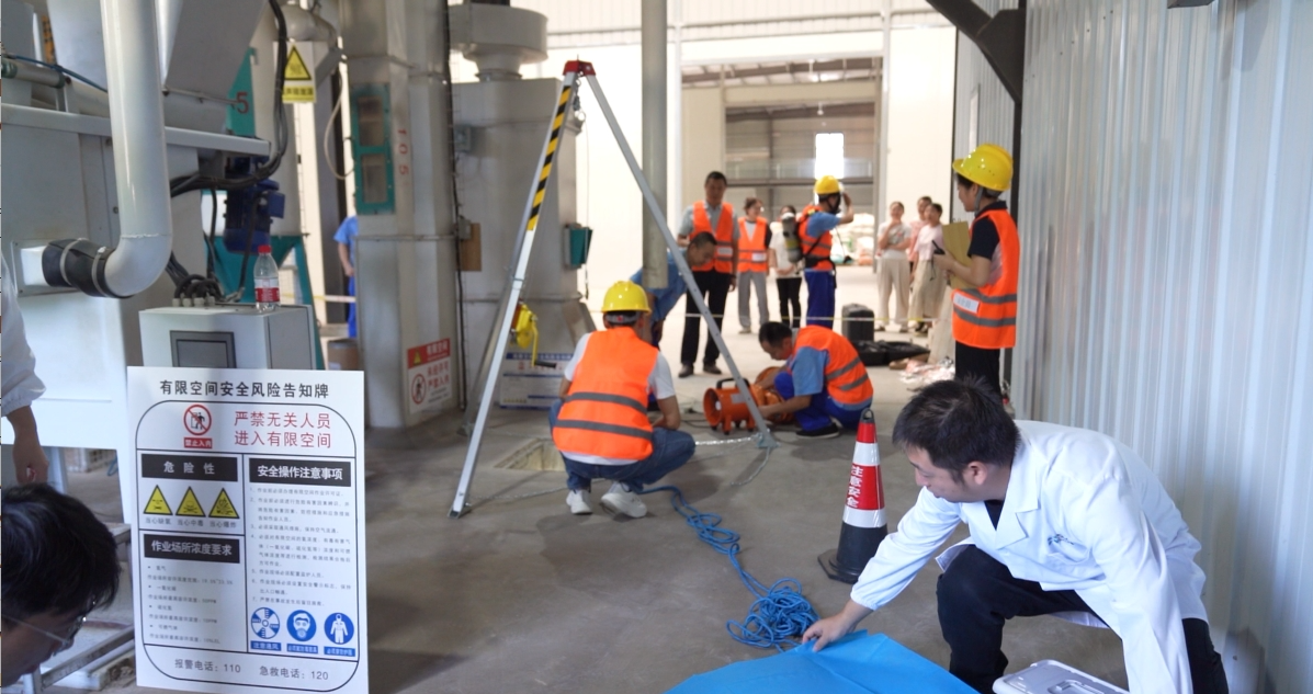 本次演練的有限空間位于混合型飼料添加劑生產車間的地下,現場作業組、檢測組、救援組、監護組等參演人員,攜各類作業設備裝備按規范流程開展準備工作。