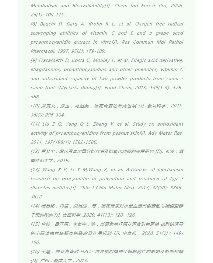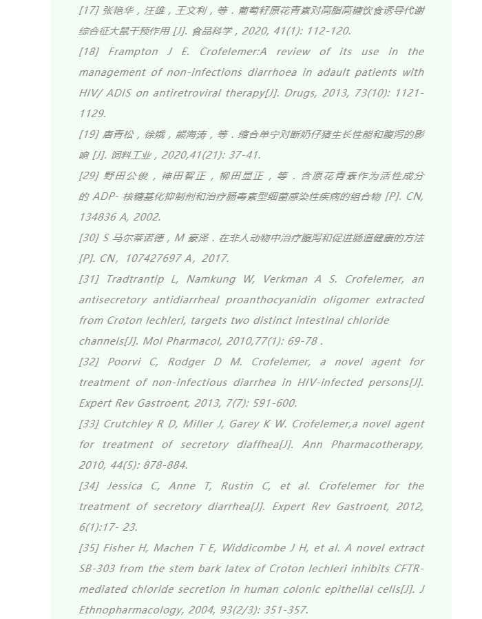 ? 其他生物活性研究: 除了抗氧化外,國內外學者對原花青素的活性展開了大量研究,主要包括降血脂、抗炎、抗動脈粥樣硬化、抗癌、調節(jié)血糖、神經(jīng)系統(tǒng)性疾病、抗腹瀉等方面 [13-17]。其中,原花青素在抗腹瀉上應用成果最為突出。2012 年,美國食品和藥品監(jiān)督管理局(FDA)批準Fulyzaq(商品名為 Crofelemer)用于治療 AIDS 患者的腹瀉癥狀;Crofelemer 提取自大戟科龍血巴豆的紅色乳膠,是一種平均分子量約為2200 ku的多種原花青素單體的隨機聚合的產(chǎn)物 [18]